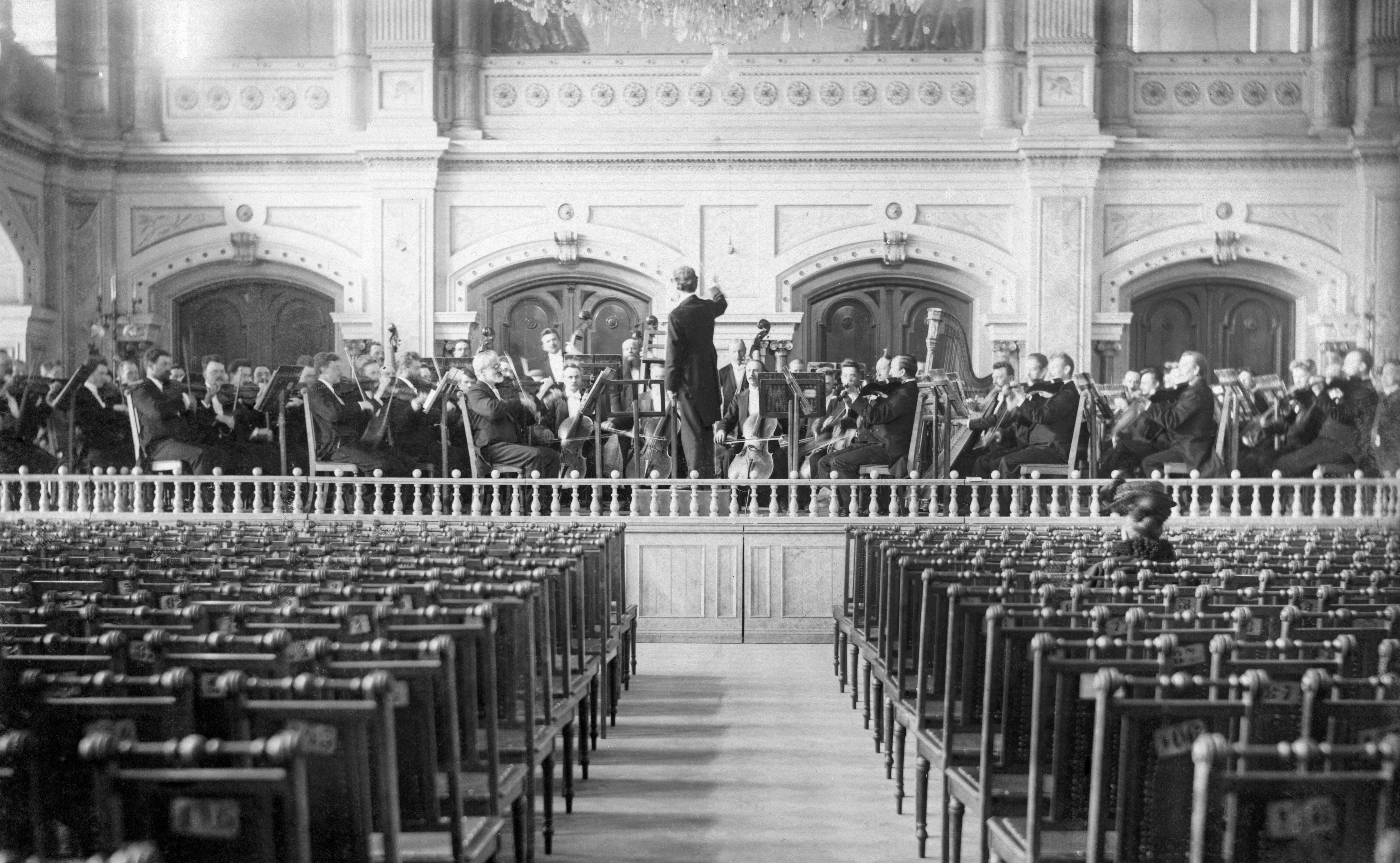Pariisin maailmannäyttelyssä 1900 järjestettiin runsaasti ohjeistapahtumia, joilla täydennettiin paviljongeissa esillä ollutta taidetta ja taidekäsityötä. Suomesta Pariisiin matkusti konsertoimaan Helsingin Filharmoonisen Seuran orkesteri (nykyisin Helsingin kaupunginorkesteri) – kuka toimi orkesterin kapellimestarina Pariisissa? Kuvassa on Filharmoonisen Seuran orkesteri harjoituksissa Palokunnantalossa Helsingissä ennen Euroopan kiertuettaan vuonna 1900.