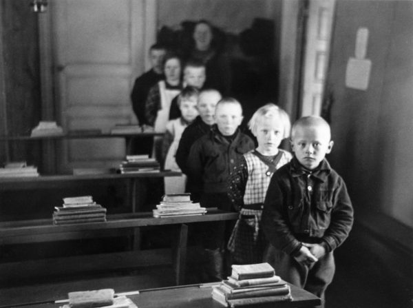 kuva 2: Katekeettakoulun oppilaita ja opettaja Lyydi Ovaskainen luokkahuoneessa Sallassa vuonna 1938. Katekeettakoulu oli kristinopin alkeita opettava kiertokoulu. Kuva: Uuno Peltoniemi, Kansatieteen kuvakokoelma, Museovirasto.