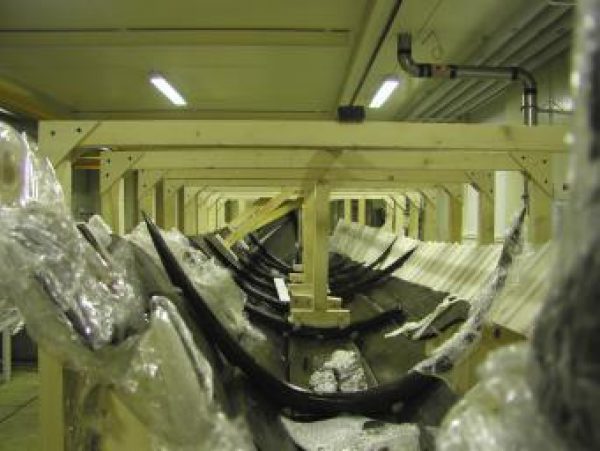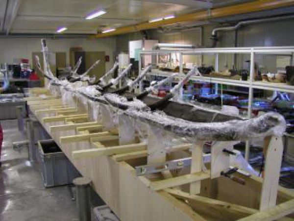 Veneen osat koottiin muunneltavaan tukikehikkoon niin, että ne voitiin taivuttaa muotoonsa vähitellen. Samalla laudat ja kaaret tuettiin niin etteivät ne pääse liikkumaan tai vääntymään tulevan kuivumisprosessin aikana.